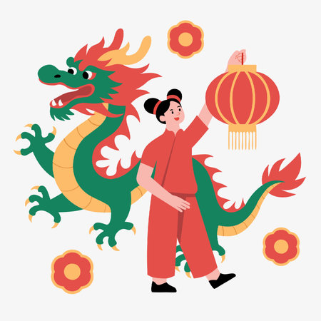 Joyful vector scene for lunar new year with a traditional chinese dragon, a woman holding a lantern, and festive decorations