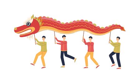 People holding Chinese New Year dragon. Traditional Asian festival vector illustration. Boys and girl walking and celebrating holiday with dragon paper animal on white background