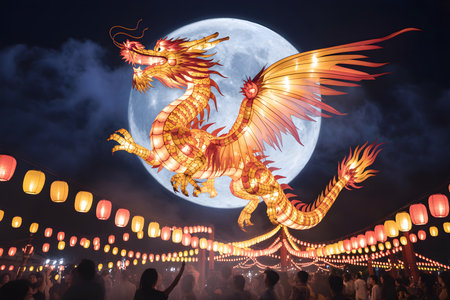 A vibrant, illuminated dragon lantern floats majestically in the night sky, silhouetted against a large full moon, with festive lanterns strung below.