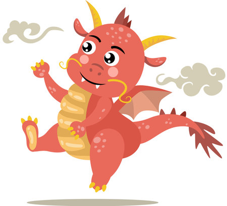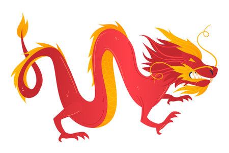 Red dragon traditional Chinese mythical creature isolated white background. Fiery dragon yellow mane red body cartoon art. Scaled claws whiskers flame tail illustrated beast