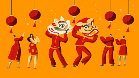 Chinese New Year Parade Character Set. Man Dance in Red Dragon Costume for China Holiday Celebration. Asian Traditional Festive Festival Greeting Card Template Flat Cartoon Vector Illustration