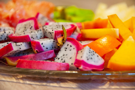 Luxury fruit mix. Tropical food. Exotic fruit. Exotic summer fruits of dragon fruit, pitaya or pitahaya. Exotic vitamin salad. Tropical salad. Island food. A vibrant display.