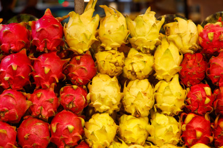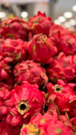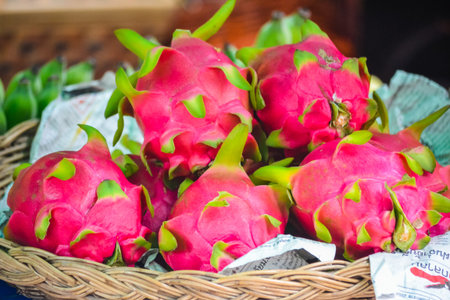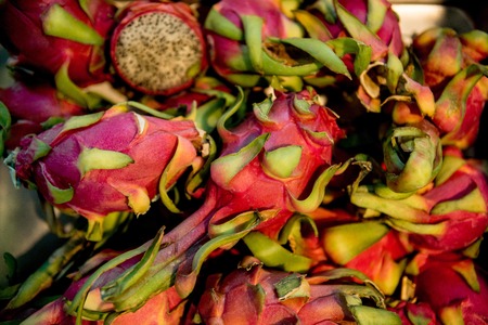 Dragon fruits for sale in market. Colorful exotic and delicious