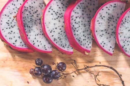 Dragon fruit or pitaya on wooden background, Tropical fruit, Table top view