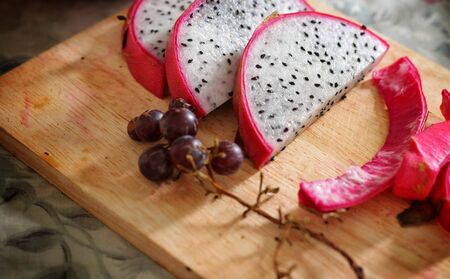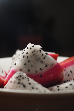 Sliced dragon fruit or Hylocereus undatus (Pitaya blanca or white-fleshed pitaya) as a simple and healthy vegan breakfast for staying healthy and fit during home quarantine due to covid-19 pandemic