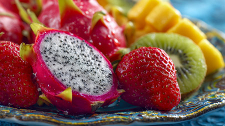 A colorful medley of juicy berries, tropical dragon fruit, bright green kiwi wedges, and golden mango pieces beautifully displayed on an ornate blue ceramic dish, pe