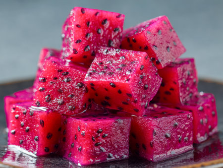 Brightly colored dragon fruit pieces with black seeds are artfully layered on a shiny plate, highlighting their enticing, succulent interior perfect for nourishing m