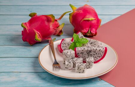 Slice of fresh ripe Dragon fruit with mint on white plate for dessert on blue wooden table