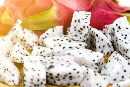 Exotic ripe white Pitaya or Dragon fruit. Red Pitahaya tropical fruit cut in cubes on white background