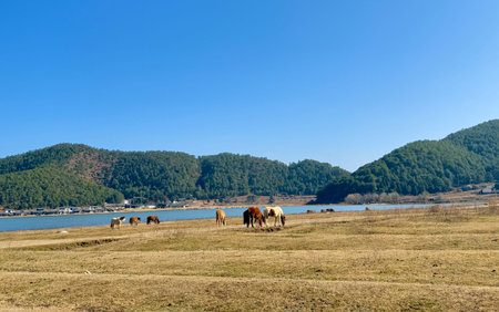 A tranquil scene featuring a group of horses grazing in a field near a calm lake, surrounded by green hills under a clear blue sky.