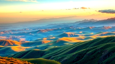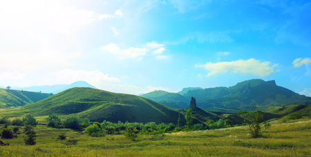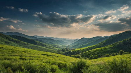 Beautiful mountain landscape with green hills and blue sky at sunset.