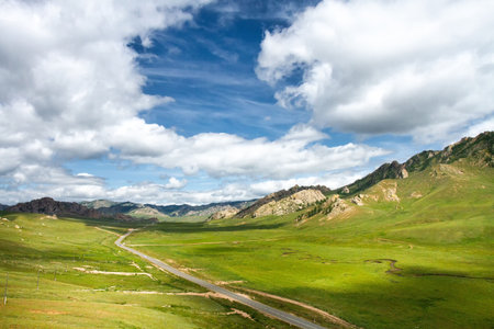 The road between the picturesque green meadows against a backdrop of sky, Mongolia.