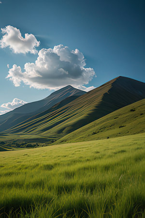 Beautiful mountain landscape with green grass and clouds in the sky.
