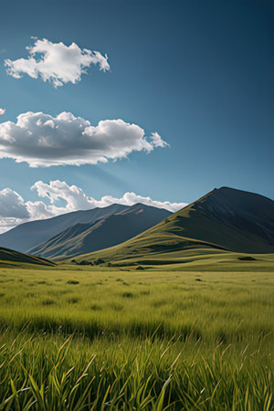 Landscape of green meadow and mountains under blue sky with clouds