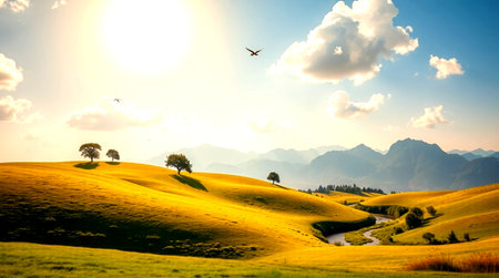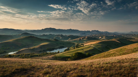 Panoramic landscape view of sunset over green hills and a river