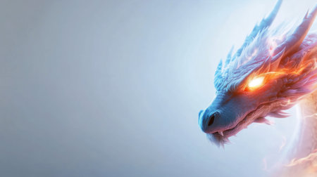 A stunning digital artwork showcasing a dragons head with glowing eyes, set against a soft, gradient background.