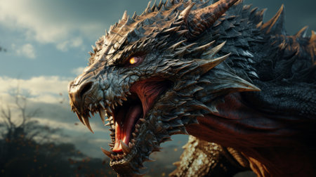 3D rendering of a fantasy dragon with red eyes and sharp teeth