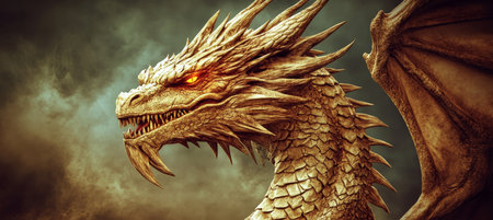 Golden Dragon Head, Fantasy Creature Portrait, Mythical Beast, Fire Breathing Monster