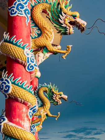 Giant golden Chinese dragon with red colum and blue sky