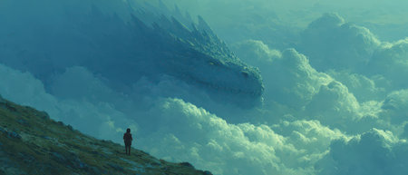A majestic dragon statue, with its golden scales and red flames, stands proudly on a cliff overlooking the serene ocean. The mythical creature appears to be guarding the coastline, its powerful presence commanding attention.