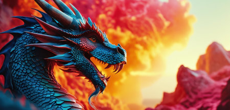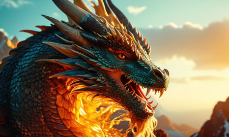 Fierce dragon with detailed scales and sharp teeth against clear sky