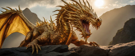 Golden dragon, scaly, with a bright metallic gold accent. Striking image of a golden dragon with a vibrant metallic scale accent.