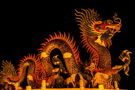 Chinese dragon in the temple at night with foggy background, China