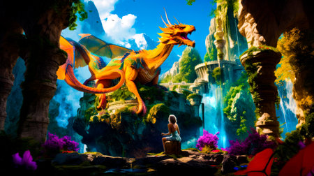 Dragon leads heroes in search of magical artifacts., generative AI