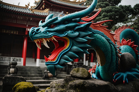 Close up shot of a beautiful and colorful dragon statue intricately with detail and a powerful expression. The statue is a symbol of strength and good fortune in Chinese culture.