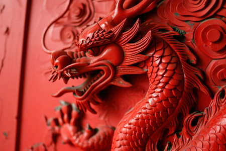Intricate dragon sculpture with detailed scales and fierce expression on vibrant red background.