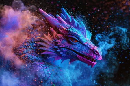 Fantasy dragon in colorful smoke on black background. 3d rendering