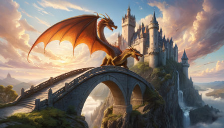 An imposing dragon spreads its fiery wings over a stone bridge leading to a fairytale castle, nestled among misty cliffs at sunrise. AI Generation