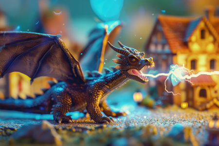 A dragon is standing in front of a house, with its mouth open and spewing fire. The scene is dark and ominous, with the dragon's menacing presence looming over the small house with Generative AI