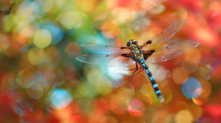 Stunning dragonfly gliding over water, showcasing vibrant colors and intricate wing patterns. Creates a serene atmosphere with beautiful bokeh effect.