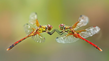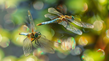 A pair of dragonflies engaged in a graceful aerial mating dance, their synchronized movements a testament to the beauty of nature's rhythms.