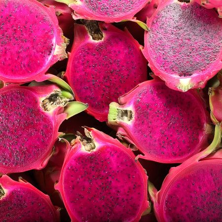 Fresh dragon fruit is sliced into even pieces, showing its vibrant pink skin and white flesh speckled with tiny black seeds, arranged neatly against a soft backdrop.
