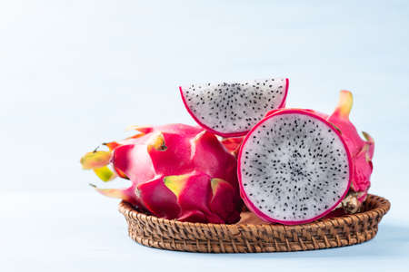 Fresh dragon fruit on blue background, Tropical fruit in summer season, Top view