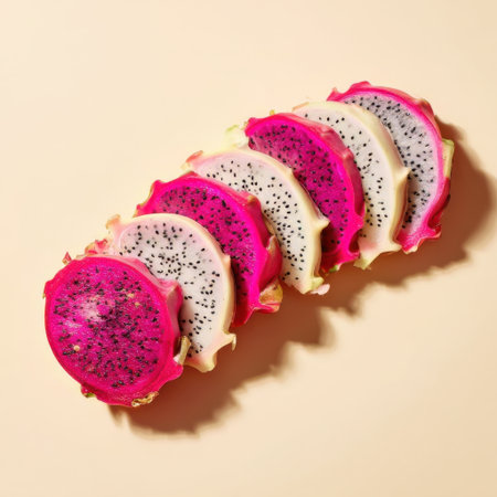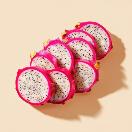 Slices of dragon fruit display vibrant pink and white flesh, arranged artistically on a soft beige surface. The contrast highlights the unique texture and colors of the fruit.