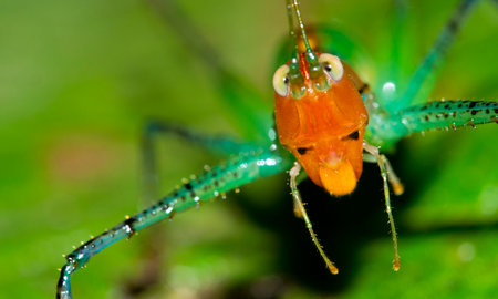 A close up of a vibrant, colorful insect with intricate details, showcasing its unique features and vivid coloring against a blurred green background