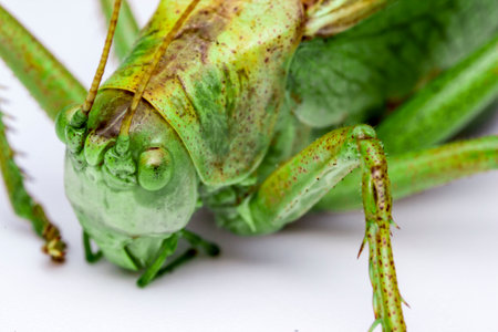 green grasshopper on a white background. insect portrait. colorful detailed macro photo of an insect. screensaver. wildlife. close-up. text space.