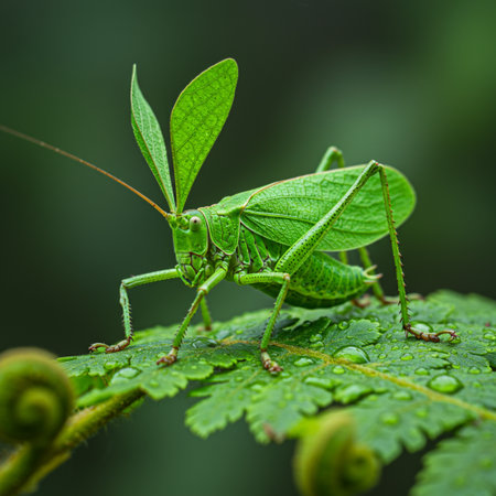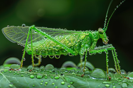 Macro Shot of Vibrant Green Insect with Water Droplets on Leaf