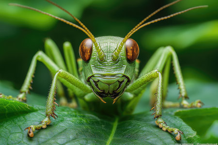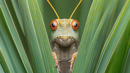A striking macro shot of a grasshopper peeking through vibrant green leaves, showcasing its detailed features and natural camouflage.