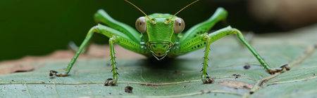 A vibrant green grasshopper is resting on a green leaf blending into its lush surroundings in a natural habitat.