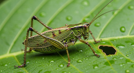 Grasshopper on a green leaf in the rain. Macro