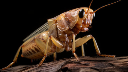 a close-up of a large brown insect captured with a canon eos 5d mark iv camera. the photo showcases realistic chiaroscuro lighting, highlighting the intricate details of the plastic insect. the insect is adorned with light orange and light gold colors, resembling wood and hopi art. ai generated