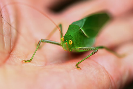 Vibrant katydid with intricate leaf like wings in natural habitat