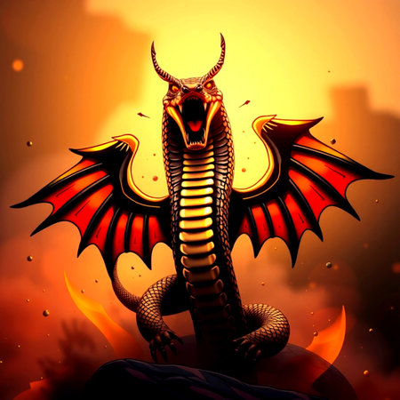 terrifying powerful dragon, Handmade mystical creature with strong wings, reptile with spikes and long tail, evil serpent with devilish look attacks enemy, magical animal flies over lake at sunset
