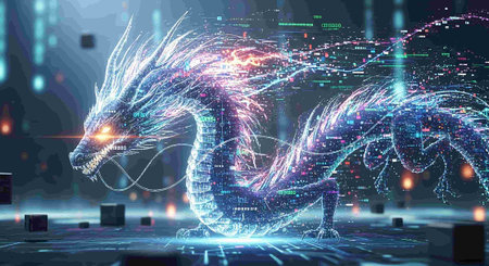 An abstract flying dragon on a dark blue background. A technological background regarding artificial intelligence, neural networks, and big data.