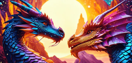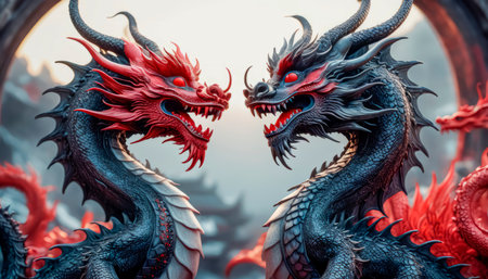 Two dragon figurines, one blue and one red, are facing each other. The blue dragon has a menacing look on its face, while the red dragon appears to be more aggressive with Generative AI