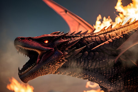 A dragon is breathing fire, with its mouth open and flames shooting out of its mouth. Concept of danger and power, as the dragon is a symbol of strength and ferocity